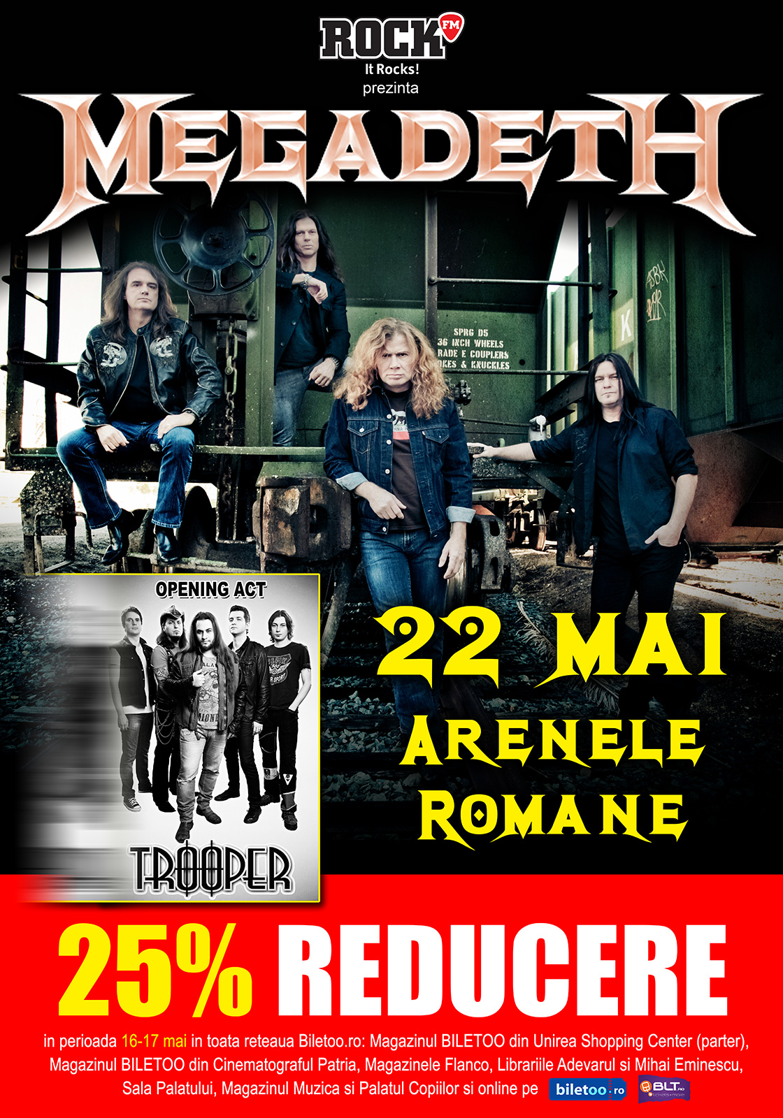 Joi si vineri (16 si 17 mai 2013) fanii muzicii rock vor putea achizitiona bilete la concertul Megadeth din data de 22 mai 2013, mai ieftine cu 25%!
